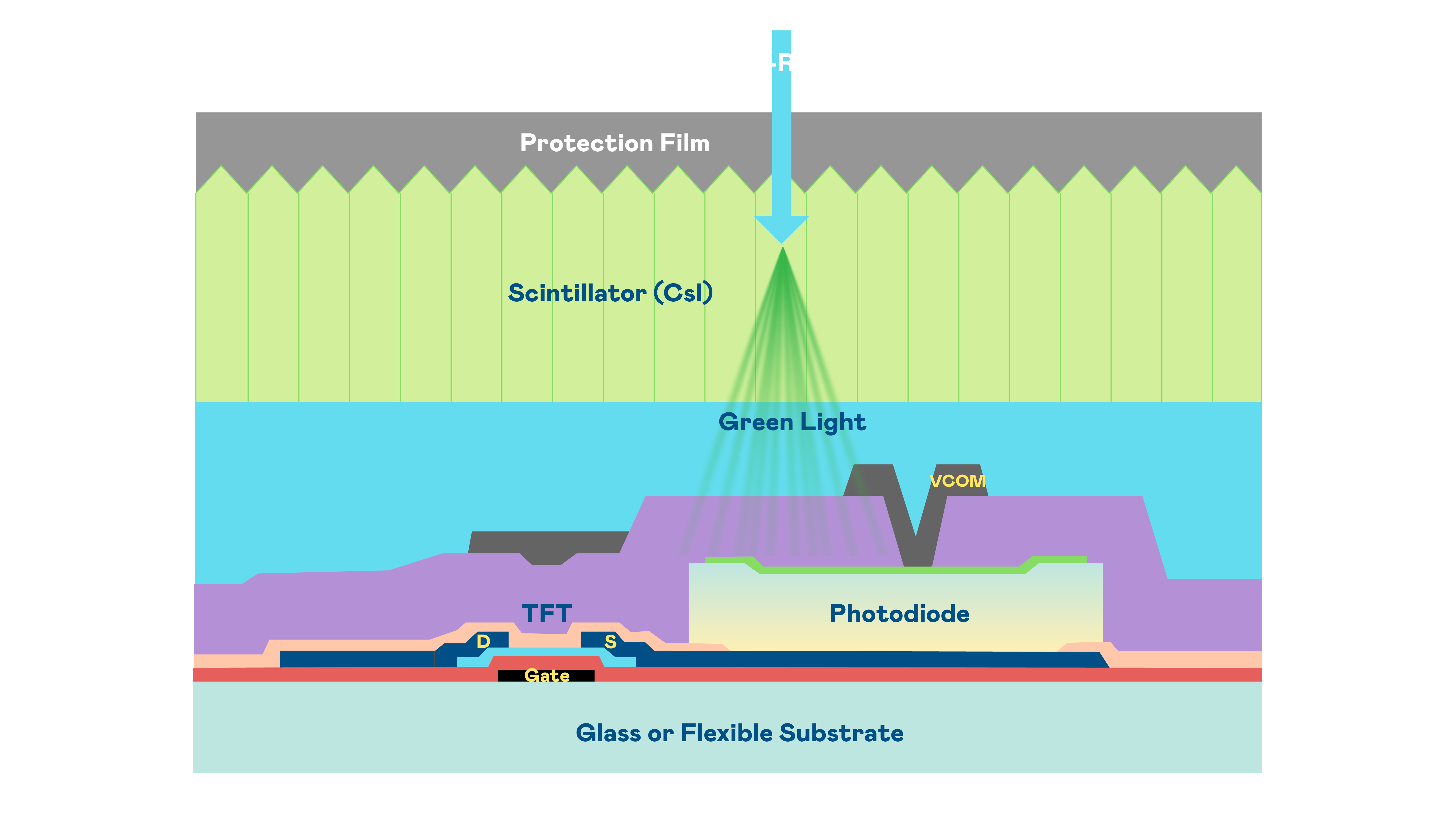 CA88的X光影像感測陣列使用薄膜電晶體 (TFT) 作為每個像素的讀取開關,搭配光電二極體(Photodiode)的光電轉換元件,用以感測X光影像訊號。